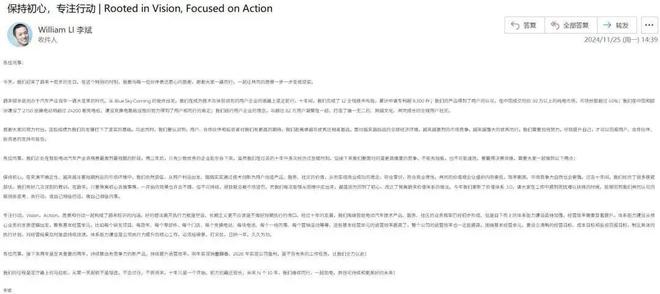 前不久,李斌在蔚来十周年之际发布了一封以“保持初心,专注行动|Rooted in Vision,Focused on Action”为主题的内部信,信中强调,蔚来不会也不能改变作为用户企业“以人为本”的初心,同时号召大家加强自上而下的体系能力建设并提升经营效率,为了愿景的实现而持续努力。