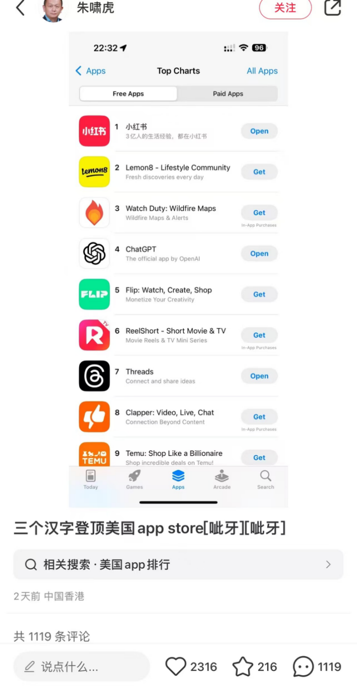 小红书最早一批投资人之一,金沙江创投合伙人朱啸虎发笔记祝贺“三个汉字登顶美国app store”,并配了二个“呲牙笑”的表情。