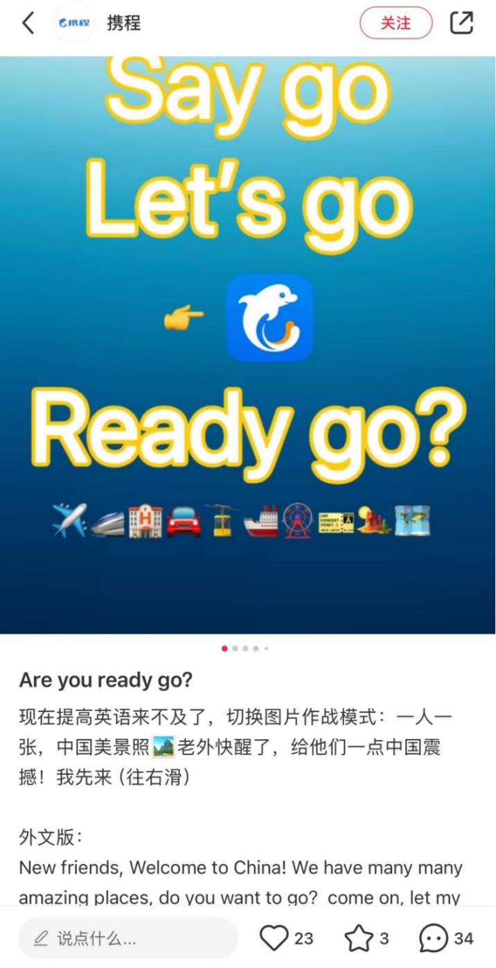 携程以“Say go,let's go(说走就走)”的口号,喊话TikTok用户,欢迎他们来中国玩。