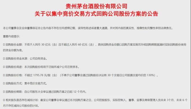 贵州茅台发布公告称,将在公司股东大会审核通过回购方案之日起12个月之内,以不低于30亿元(含)且不超过60亿元(含)回购公司股份。