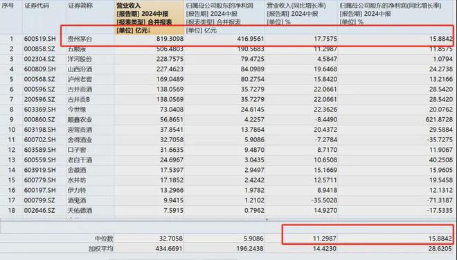 上半年,茅台实现营业收入819.31亿元,比营收规模排名二、三位的五粮液和洋河股份两者之和都要高;归母净利润高达416.96亿元,遥遥领先其他白酒企业。