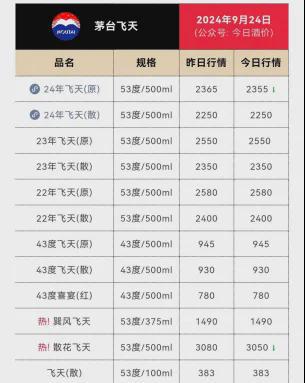 数据显示,9月12日,飞天茅台原箱批发价格为2550元/瓶,散瓶2380元/瓶,与2023年同期相比分别下跌450元、375元;到了9月24日,2024年飞天茅台原箱价格已经跌到2355元/瓶,散瓶跌倒2250元/瓶。