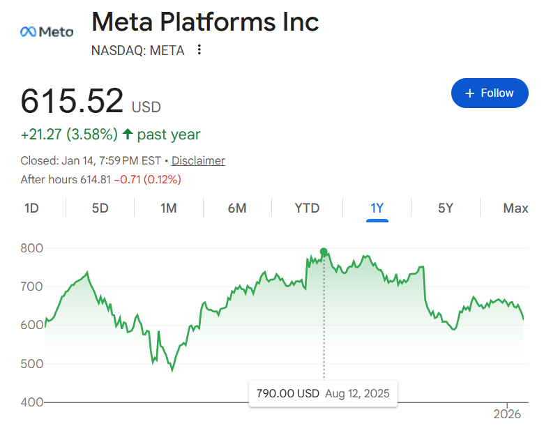 受此消息影响,周三Meta股价收跌2.47%,报615.52美元/股,已是连续第三个交易日下跌,距离去年8月创下的历史高点越来越远,总市值缩水到1.55万亿美元。