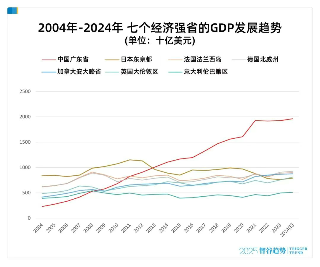过去20年,广东先后打败了意大利第一省(伦巴第州)、加拿大第一省(安大略省)、英国第一省(大伦敦区)、德国第一省(北莱茵-威斯特法伦州)、法国第一省(法兰西岛大区)、日本第一省(东京都)……