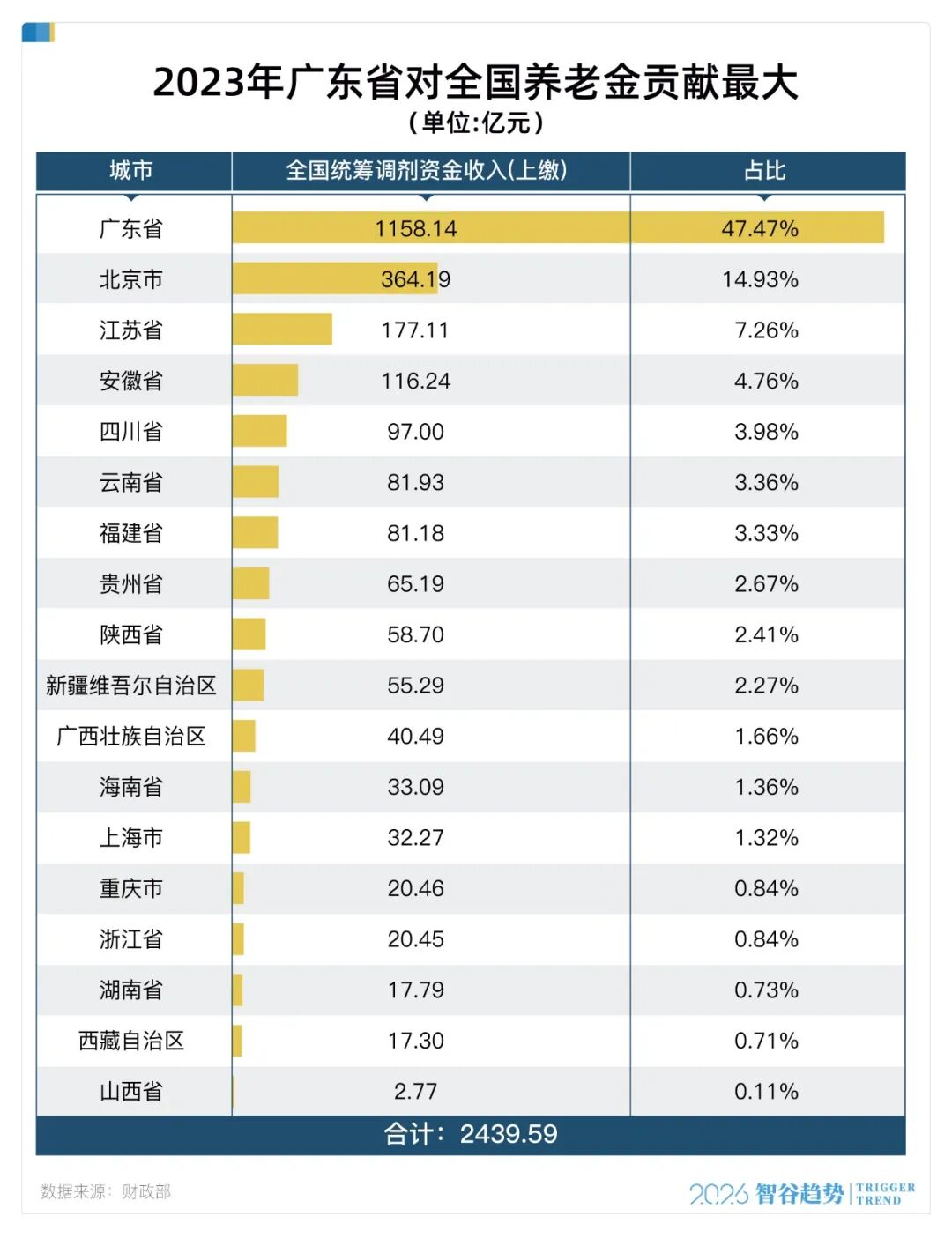 根据财政部披露的信息,2023年全中国32个省市区,有18个需要上缴资金,总数超过2439亿,调剂给14个入不敷出的地方,特别是老年人比例较高的东三省。