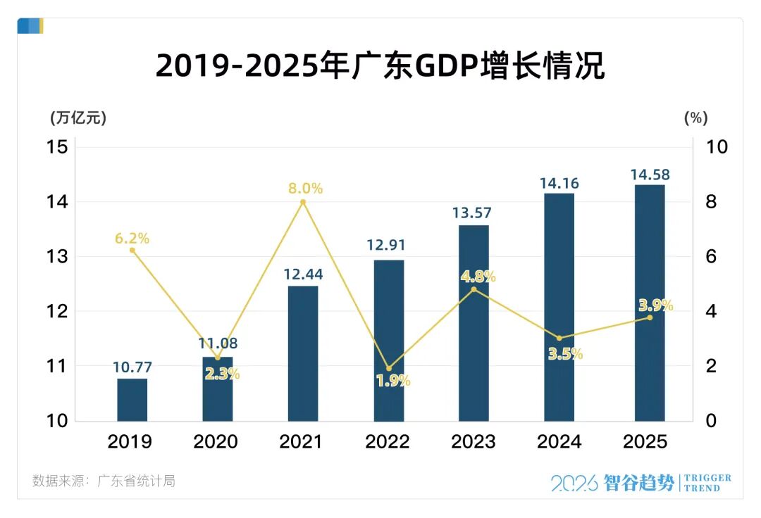 就在今天,广东官宣:2025年地区生产总值14.58万亿,增长3.9%,总量连续37年位居全国第一,继续领跑。