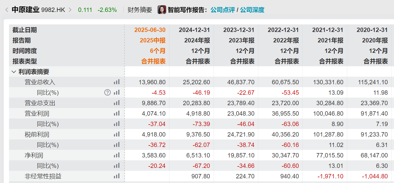 进入2025年,下降的态势仍在延续。2025年上半年,中原建业实现营收1.40亿元,同比减少4.5%;归母净利润为0.36亿元,同比减少20.2%;归母净利润率下滑至25.7%。