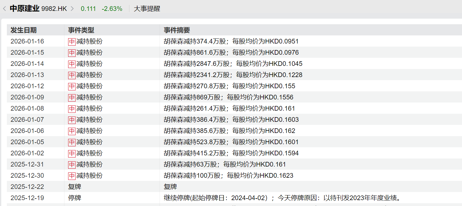 不过,值得注意的是,在中原建业恢复交易的一个多月来,胡葆森却多次进行减持。时代周报记者查询港交所公告获悉,2025年12月30日至2026年1月16日,胡葆森共计减持13次,合计减持超9700万股,占公司总股本的2.51%,套现超1000万港元。