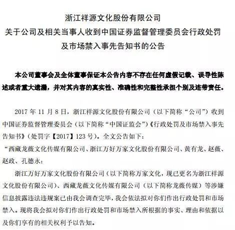 祥源文化晚间发布公告称,公司收到证监会行政处罚及市场禁入事先告知书,万家文化(已更名为祥源文化)、龙薇传媒等涉嫌信披违法违规案已调查完毕,依法拟对龙薇传媒、万家文化、黄有龙、赵薇、赵政、孔德永作出行政处罚和市场禁入。