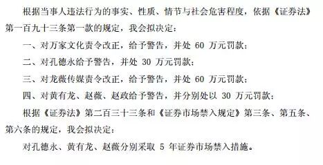 公告显示,根据当事人违法行为的事实、性质、情节与社会危害程度,依据《证券法》第一百九十三条第一款的规定,证监会拟决定:一、对万家文化责令改正,给予警告,并处60万元罚款;二、对孔德永给予警告,并处30万元罚款;三、对龙薇传媒责令改正,给予警告,并处60万元罚款;四、对黄有龙、赵薇、赵政给予警告,并分别处以30万元罚款;