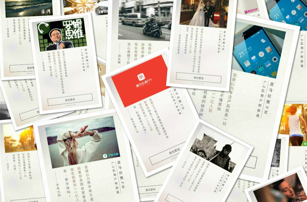 营销案例:2015年初,国内最大的音频分享平台喜马拉雅FM用户突破1.2亿,平台上有超过700W条声音,4000个自媒体,数千品牌入驻。在1月29日,喜马拉雅FM启动主题为#对1.2亿人说#的线上活动,霸气醒目的说“【喜马拉雅FM】1.2亿用户了,今天不听节目,就听你说。”将APP开屏广告和手机设为奖品,以微博微信为主阵地,其他社交媒体包括豆瓣、贴吧、空间等为辅助,最终有超过20000个普通网友参与本次活动,产生了超过5000万的曝光量。