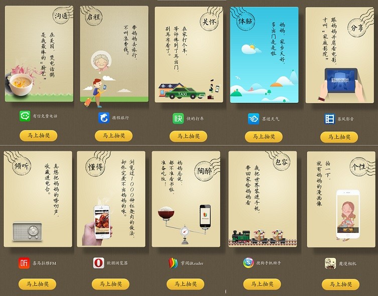 这是近期市场上最大规模APP之间的营销合作案例。合作的企业不仅都用户过亿,而且都是各个领域首屈一指的巨量级APP。基于庞大的用户基数、切合春节点的“亲情”主题、优美的设计风格和最新的H5展现形式,以及10家APP在同一时间在各大平台统一推广的资源整合,此次联合营销在小投入的基础上,使各家取得倍增的宣传效益。