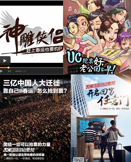 营销案例:围绕春节抢票活动,UC浏览器的营销推广可谓四处开花,大方光彩!第一,借势热点打造趣味病毒视频。以陈妍希版小龙女为题材,祭出《神雕侠侣之杨过抢票,赶上春运也要约P》短视频,将杨过与小龙女16年后的相遇过程与春运抢票结合在一起,配合经典的还珠格格插曲,节奏紧凑、信息量大,产品植入巧妙。仅在腾讯视频这个平台,就达到了近37万的播放量。以小搏大效果显著。