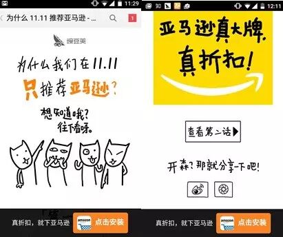 营销案例:与其说这是豌豆荚的营销案例,不如说这是豌豆荚“生财有道”。2014年亚马逊双11“卡位战”,豌豆荚基于自身数亿用户的平台,使用幽默简笔漫画,真诚走心地向用户推荐亚马逊的“正品”和“真折扣”两大亮点,用户对活动的分享率高达15%,双11活动期间,亚马逊手机客户端实现每日下载量5倍的增长。