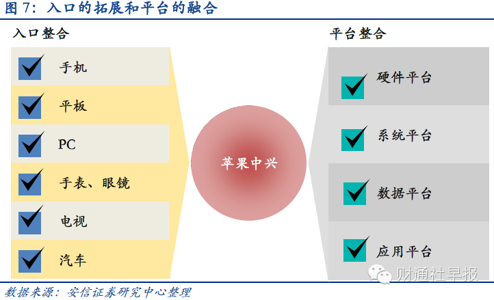 2)苹果已经掌握了最大的入口,并成功整合了四大平台:远超其他品牌的硬件创新平台,以iOS,OSX为主的生态系统平台,围绕AppStore所产生的应用平台和数据平台。