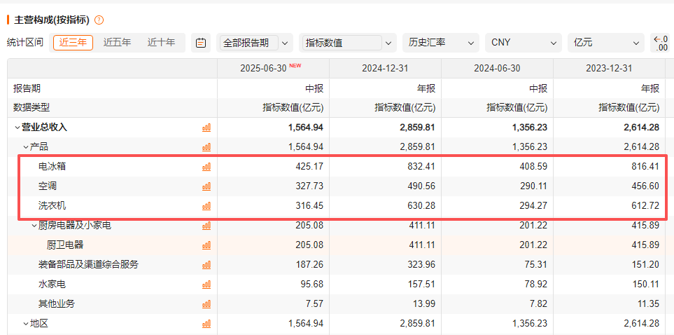 海尔智家的核心产品,还是传统三大件:冰箱、洗衣机、空调。问题在于,这三条腿里,有两条所处赛道已经明显放缓。奥维云网数据显示,2025年上半年冰箱市场零售额同比只涨了3.5%,洗衣机也不过4.2%,都明显跑输整个家电市场9.2%的增速。