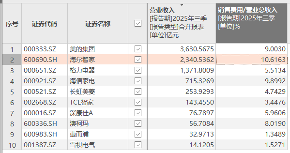 2025年前三季度,海尔智家的销售费用占营业总收入比例高达10.6%,而美的只有约9%,格力更是控制在5.5%左右。