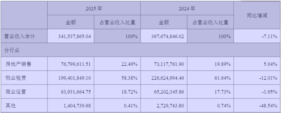 2025年,物业租赁业务仍为*ST阳光最大收入来源,占比达58.38%。报告期内,该业务实现收入约2亿元,同比下降12.01%;商业运营业务实现收入6393.17万元,同比下降1.95%。