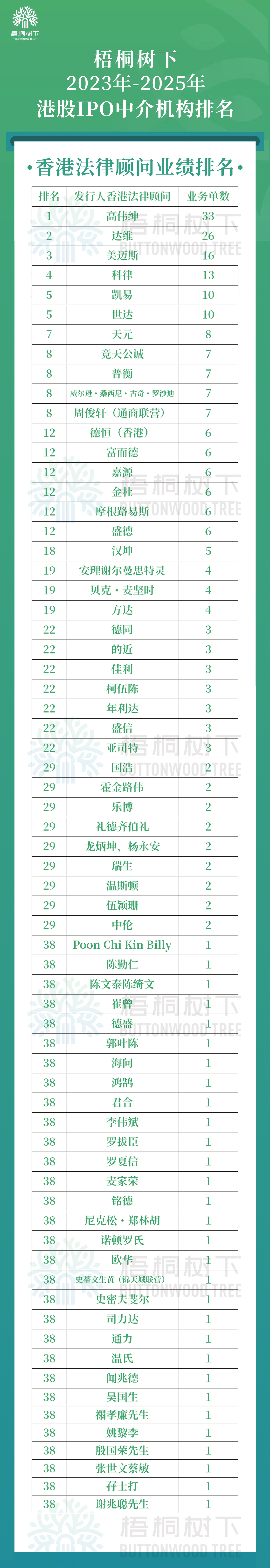 2023-2025年,共有67家香港法律顾问为这252家香港IPO上市公司提供了法律服务,其中聘请多家法律顾问的拆开计算,各计1单。(注:仅统计发行人的香港法律顾问)