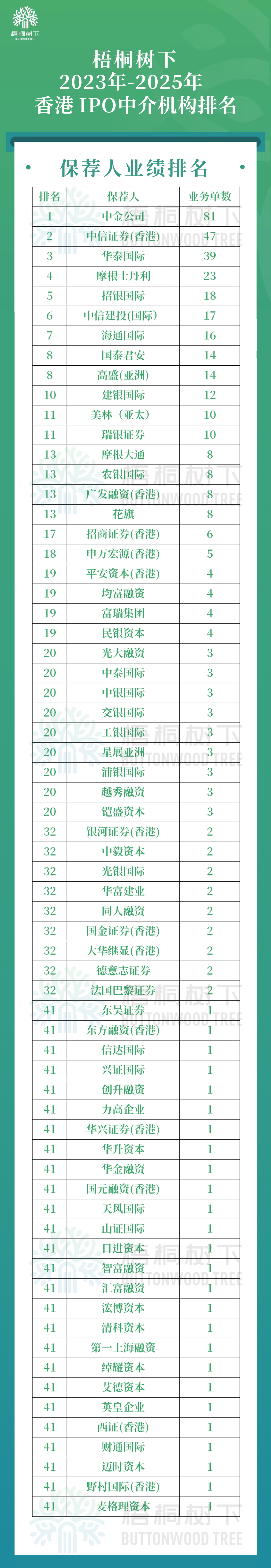 2023-2025年这三年间,港股成功上市企业合计263家,其中GEM 转主板上市5家,介绍上市3家,SPAC 并购上市3家,这11家不纳入本次统计中。港股首发上市的252家公司的IPO中介机构包括66家券商、67家香港法律顾问、44家中国法律顾问、14家会计师事务所。其中,中金公司保荐81单,位列第一;高伟绅律所占据香港法律顾问之首,业务单数为33单;竞天公诚占据中国法律顾问之首,业务单数为41单;“四大”则包揽了近90%的审计业务,安永73单、毕马威55单、罗兵咸永道55单、德勤42单。