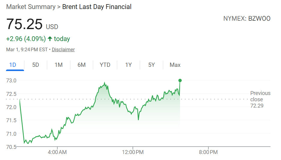 分析人士预测,这种情况可能将油价推高至每桶100美元以上。由于市场对美伊冲突的预期不断升温,布伦特原油价格在过去一个月上涨了近12%,目前已接近七个月来的高点,达到每桶73美元。