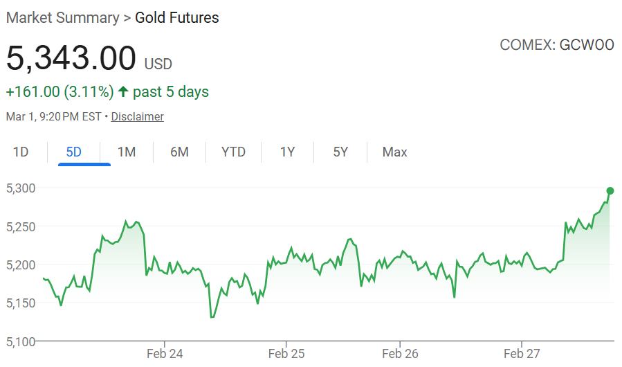 黄金期货(GC=F )开盘即飙升超过2.5%,突破每盎司5380美元。另一种贵金属白银(SI=F)也上涨2.8%,突破每盎司95美元。