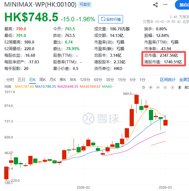 在上一轮炒作中,MiniMax的股价迅速走高,如今从最高点下来已经回调超22%,市值也回落至2347亿港元,估值仍然给得很高。