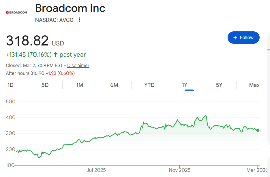 总部位于加州帕洛阿尔托的博通将于周三公布2026财年第一季度业绩。在过去的一年时间里,博通股价暴涨70%,总市值达到1.51万亿美元。