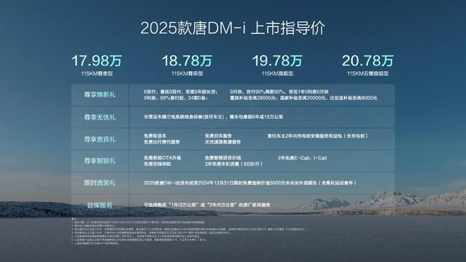 此次,2025款唐DM-i共推出4款车型,售价17.98万~20.78万元。同时,比亚迪为用户准备了包括“尊享焕新礼、尊享无忧礼、尊享贵宾礼、尊享智联礼、限时选装礼、延保服务”六重购车礼遇。