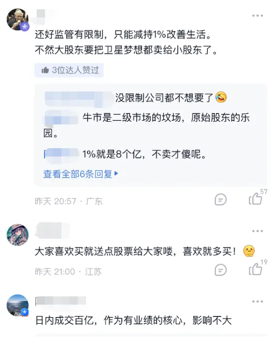 消息一出,网友吵翻天了。有的吐槽“一点格局都没有”,有的戏称,“还好有监管限制,只能减持1%改善生活,不然大股东要把卫星梦卖给小股东了”。
