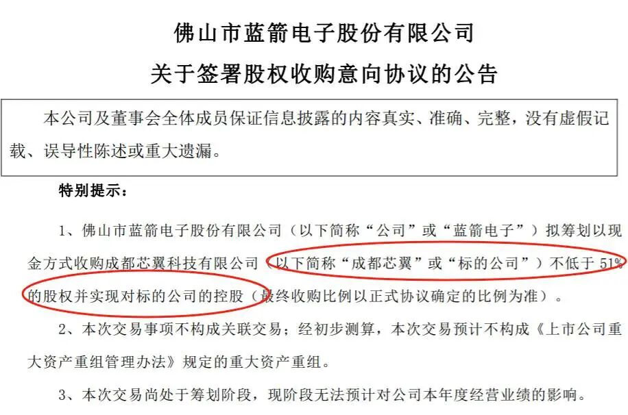 根据公告披露的交易架构,蓝箭电子将采用纯现金收购模式,目标是拿下成都芯翼不低于51%的股权,实现绝对控股。