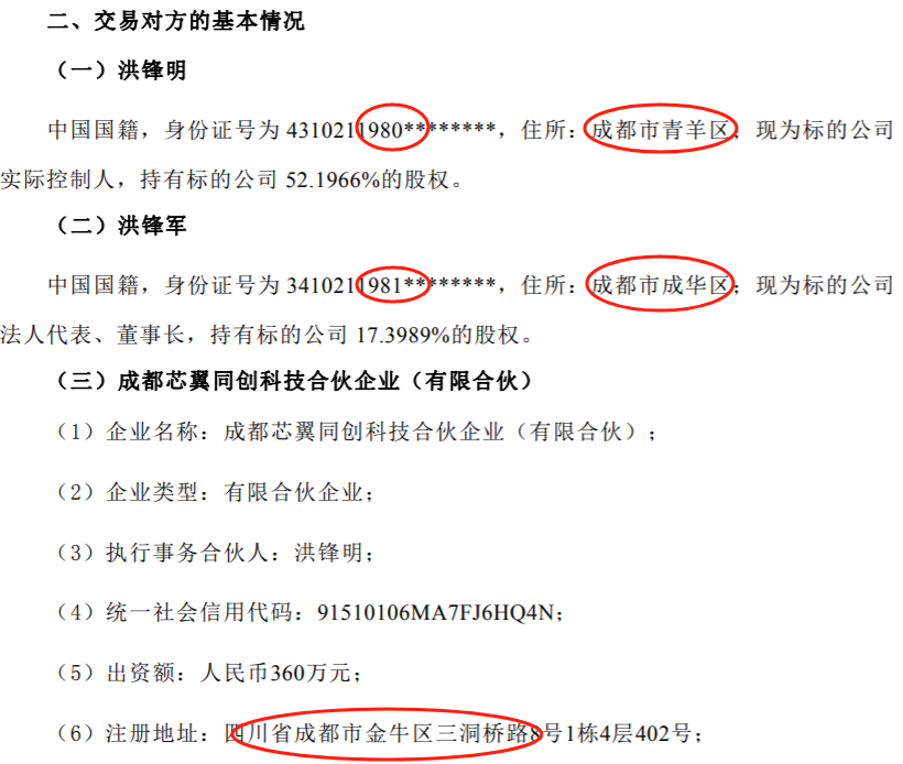从公告来看,洪锋明出生于1980年,家住成都市青羊区,目前持有成都芯翼52.1966%的股权。洪锋军出生于1981年,家住成都市成华区,目前持有成都芯翼17.3989%的股权。成都芯翼同创科技合伙企业(有限合伙)持有成都芯翼17.3989%的股权,由洪锋明担任执行事务合伙人。由此可见,两个80后对成都芯翼具有绝对控股权。