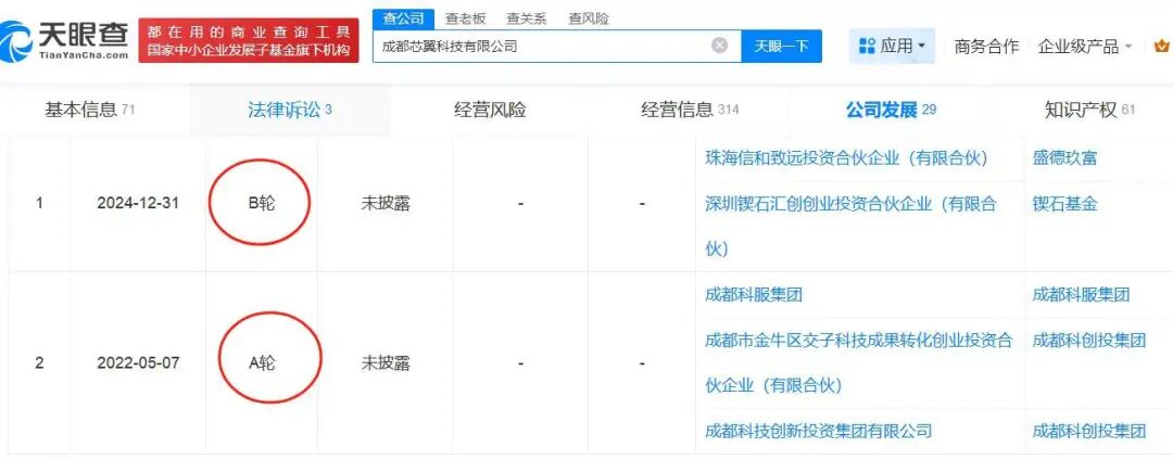 天眼查显示,2022年5月,成都芯翼获得成都科服集团、成都科创投集团旗下机构A轮融资。2024年,成都芯翼完成B轮融资,投资方来自珠海的盛德玖富和锲石基金。