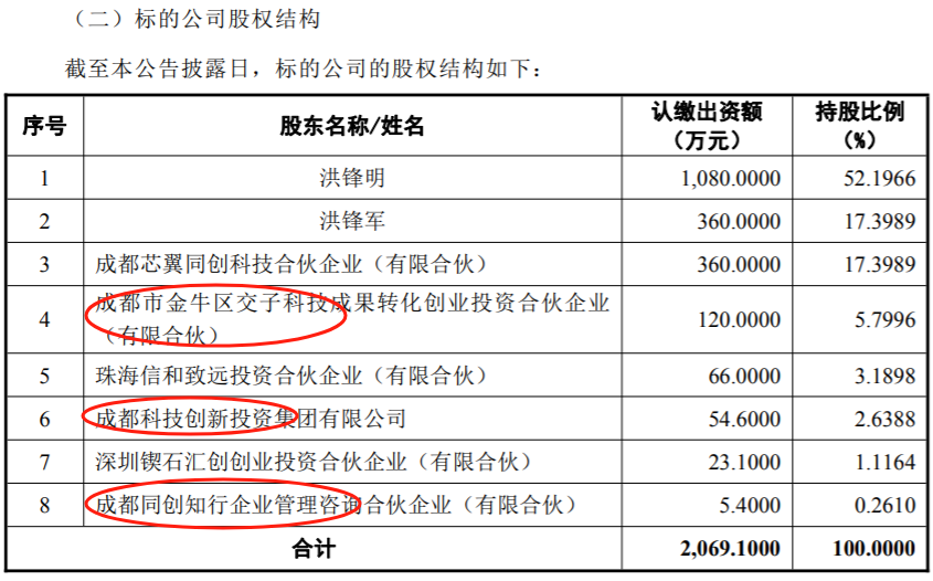 值得注意的是,多只成都本土创投基金也是成都芯翼的股东。成都金牛区国资旗下基金持有5.7996%;成都科技创新投资集团持有2.6388%;成都同创知行持股较少。