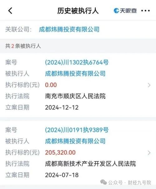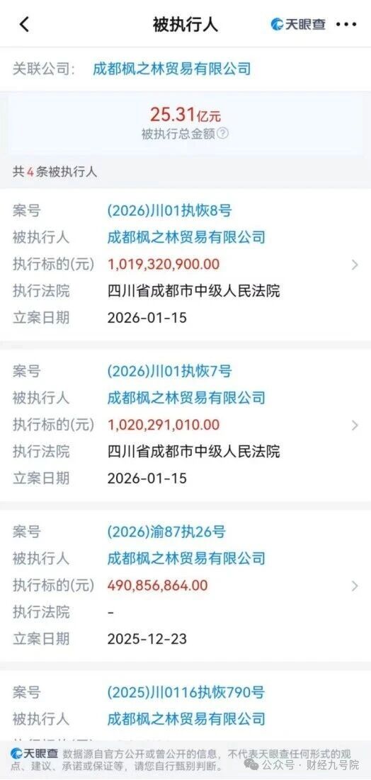 值得注意的是,从天眼查披露的法院执行信息的案件号来看,万腾实业、枫之林贸易和成都云上投资似乎均卷入了同一桩案子,因为使其成为被执行人的一件案子案号均为2026川01执恢7号。