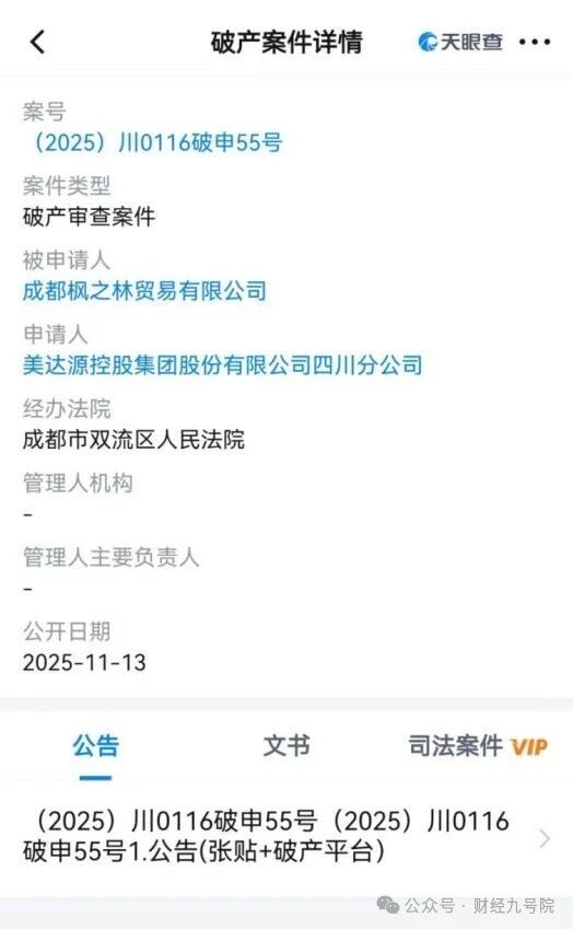 而据成都双流区法院2025年11月份的裁定,美达源控股集团股份有限公司四川分公司申请了对成都枫之林贸易有限公司的破产。