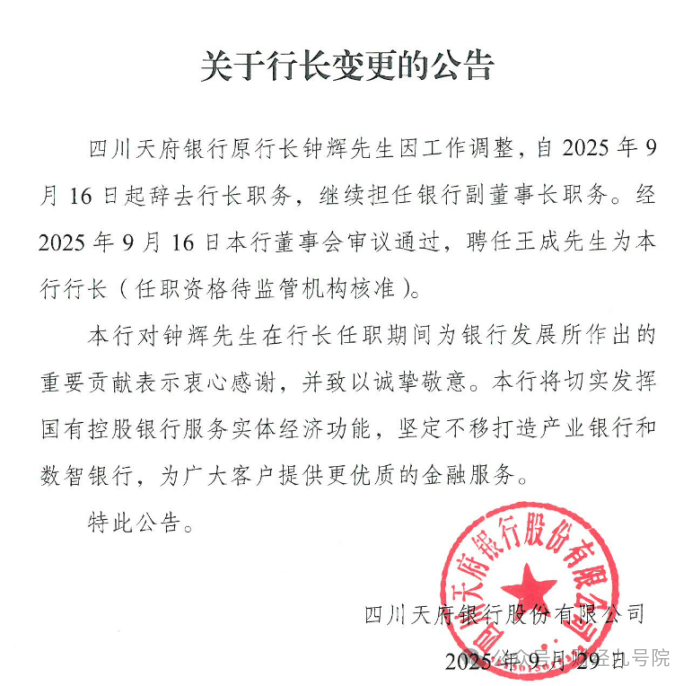 事实上,天府银行的公司治理问题,从高管任职风波也可见一斑。2025年9月16日,原行长钟辉辞职,董事会聘任王成担任新行长,但截至2026年2月初,王成的任职资格仍未获监管核准,行长职位已空缺超过4个多月。