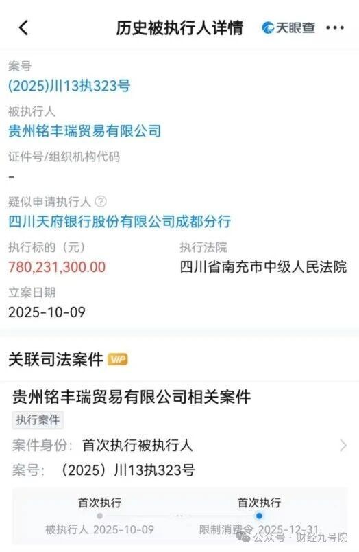 第八大贷款客户贵州铭丰瑞贸易有限公司的情况更具讽刺性。该公司截至2024年底在天府银行贷款余额7.56亿元,在2025年11月份因7.8亿元债务被申请执行并限制消费,而申请执行方正是天府银行成都分行。