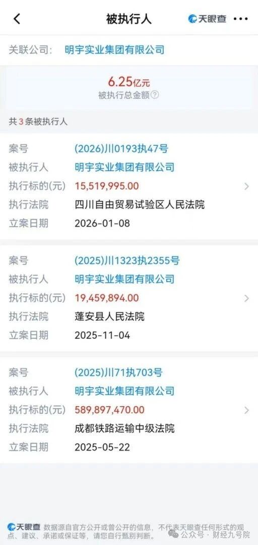 第三大股东四川明宇集团有限公司持股5.32%,2025年8月新增3600万元被执行信息,同年12月因未履行给付义务被限制消费,涉案总金额达7.8亿元;截至今年1月底,四川明宇实业集团被执行金额仍然高达6.25亿元,且该公司已经成为最高院所公示的失信被执行人。