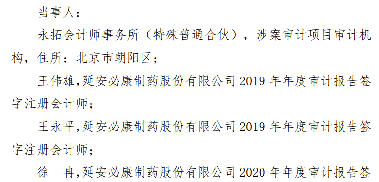 根据中国证券监督管理委员会《行政处罚决定书》(〔2025〕113 号)查明的事实,永拓会计师事务所(特殊普通合伙)(以下简称永拓所)、王伟雄、王永平、徐冉、刘菊芳在为延安必康制药股份有限公司(以下简称延安必康)2019 年度和2020年度财务报表提供审计服务过程中,存在以下违规行为: