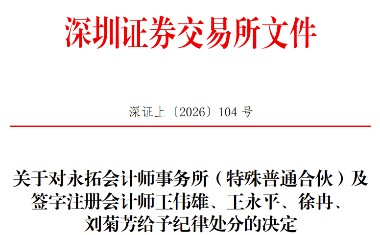 2月4日,深交所公布《关于对永拓会计师事务所(特殊普通合伙)及签字注册会计师王伟雄、王永平、徐冉、刘菊芳给予纪律处分的决定》。根据中国证监会《行政处罚决定书》(〔2025〕113 号)查明的事实,永拓所、王伟雄、王永平、徐冉、刘菊芳在为延安必康制药股份有限公司2019 年度和2020年度财务报表提供审计服务过程中,存在以下违规行为: