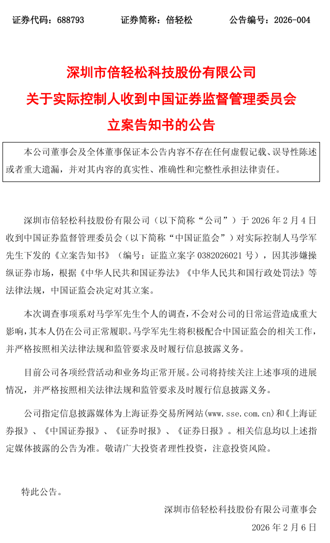 2月6日,倍轻松披露公告称,2月4日收到中国证监会对实控人马学军下发的《立案告知书》,因其涉嫌操纵证券市场,根据相关法律法规,中国证监会决定对其立案。