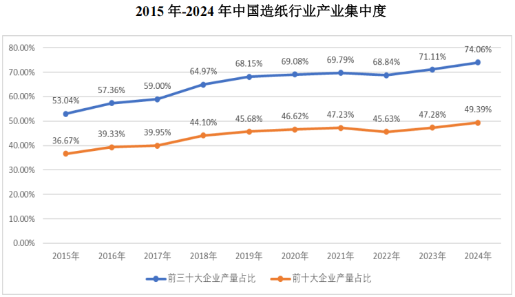 从行业演进逻辑看,集中化是造纸行业不可逆转的趋势。近年来,国家通过关停并转、重组整合等方式,持续淘汰污染严重的小型纸厂,将市场份额和节能减排指标向具备技术、规模优势的龙头及大中型高新技术企业集中。2015至2024年间,我国造纸行业前10名企业的产量占比从36.67%提升至49.39%,前30名企业占比更是从53.04%飙升至74.06%,中小产能加速出清,规模效应日益成为核心竞争力。