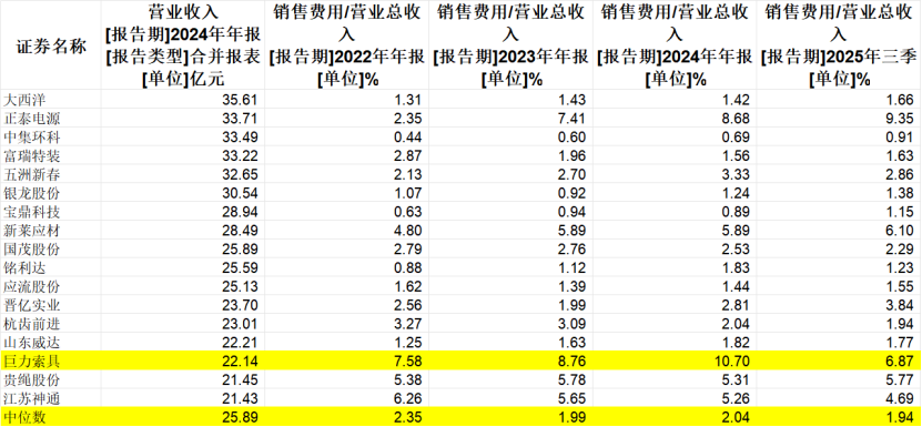 也就是说,巨力索具在销售端的投入强度,是同行中位数的数倍。