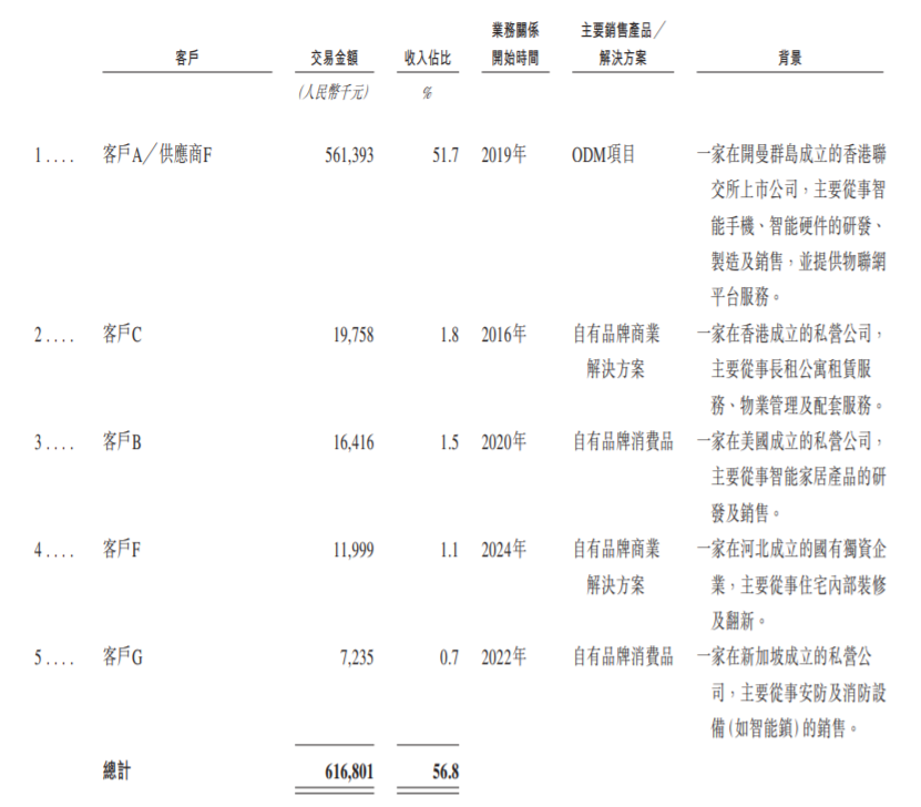 其中,对第一大客户小米的销售额分别高达4.93亿元、5.61亿元和4.69亿元,占同期总收入的48.6%、51.7%及60.6%。