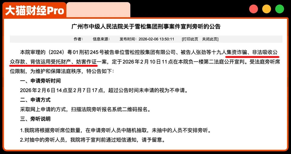雪松控股的老板张劲涉集资诈骗、非吸、背信运用受托财产、妨害作证等,根据法院的预告,判决将在2月10日下来。