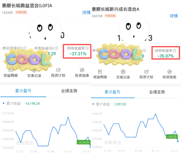 他晒出的图片显示,持有景顺长城鼎益A、景顺长城新兴成长A两只基金,分别跌了37%、35%。