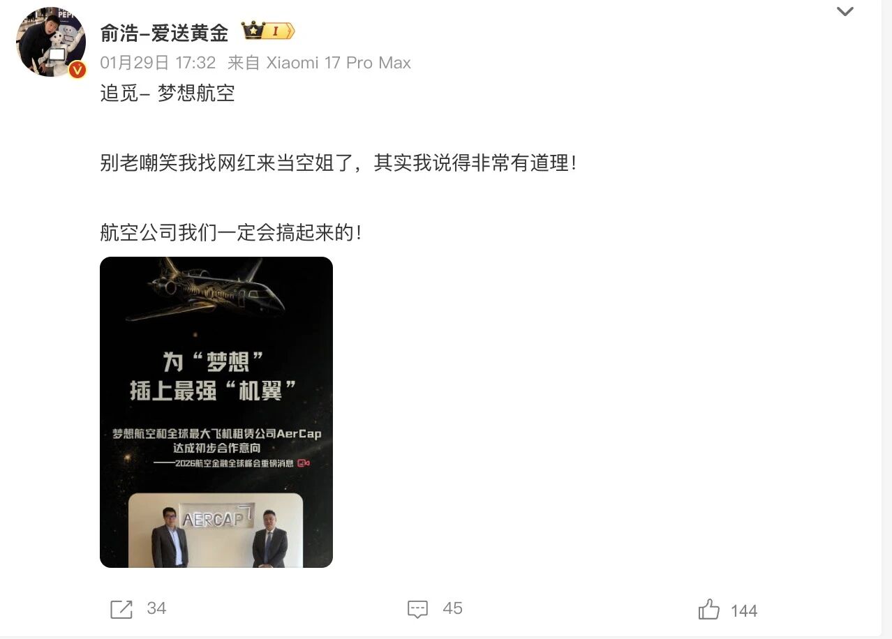 2026 年 2 月的第一天,俞浩再次在科技圈刷屏。