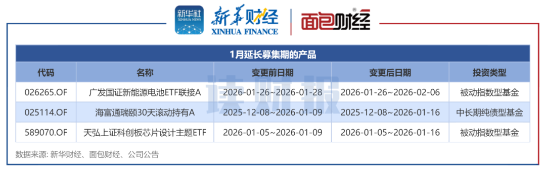 另一方面,根据公告日期口径,1月共有3只基金宣布延募,包括广发国证新能源电池ETF联接、海富通瑞颐30天滚动持有等产品。