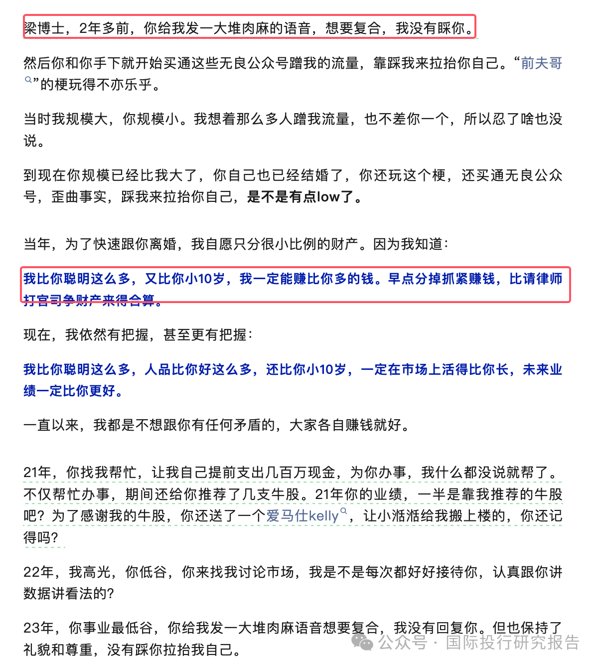 李蓓狂喷前夫哥:梁博士,请你以后管理好你的手下,你的水军,你养的自媒体账号们 国际投行研究报告 · 2026.02.09 10:14 · 2,229阅读 · 资讯 来源: 国际投行研究报告 发稿编辑: 国际投行研究报告 0 0 0 微博 复制链接 国际投行研究报告 深蓝号 前专业财经记者、九三学社社员、上海中华职教社社员、上海太平洋区域经济发展研究会理事!个人读书笔记,专业财经研究,我读什么你看什么。 关注 12 篇资讯 1 粉丝 最近资讯 阿里腾讯百度字节AI大战的归宿:不烧技术烧奶茶和红包! 新型家庭危机:AI成瘾 羡慕美股投资人!道指50,000点:将股市推向新高的AI热潮,正演变为新的风险引爆点 本文系作者 国际投行研究报告 授权深蓝财经发表,并经深蓝财经编辑,转载请注明出处、作者和本文链接。 本内容来源于深蓝财经,文章内容仅供参考、交流、学习,不构成投资建议。 想和千万深蓝财经用户分享你的新奇观点和发现,点击这里投稿。 创业或融资寻求报道,点击这里。